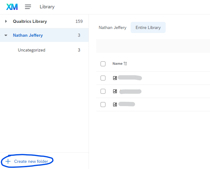 By default, you will see a Qualtrics Library that has template questions for all users, and a personal library with your name. Group and division libraries (e.g., “ACES Qualtrics Library” or “University Housing”) may also appear based on your group membership.