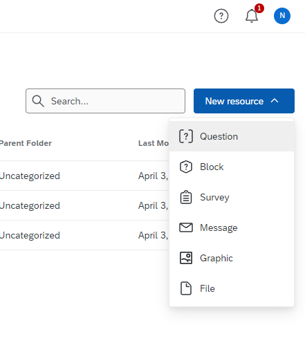 Libraries can contain questions, files, images, and entire surveys. To add resources to your library, click “New resource” on the right side of the screen, then choose the appropriate type.